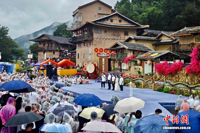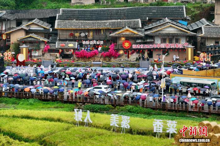 9月23日,公众冒雨参与丰产节举动。(无人机相片)中新社记者 王东亮 摄